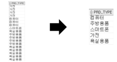 - 예시) SELECT DISTINCT PRD_TYPE