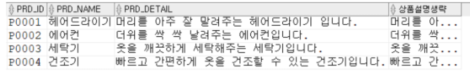 , SUBSTR(PRD_DETAIL , 1 , 5) || '...' AS 상품설명생략 -- 첫번째부터 5번째 단어까지 출력 (띄어쓰기 포함)