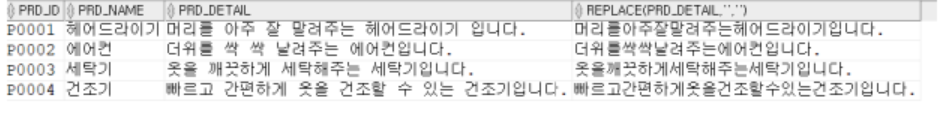 , REPLACE(PRD_DETAIL , ' ' , '') --값에 있는 띄어쓰기(' ') 를 공백('')으로 치환
