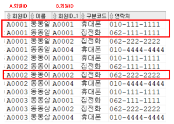 FROM 회원 A, 회원연락처 B