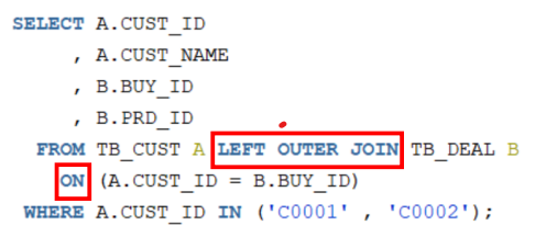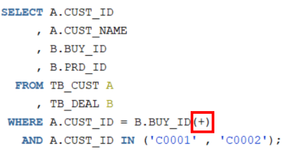 WHERE A.회원ID = B.회원ID (+) ; -- (+) 기호는 OUTER JOIN을 의미, 없으면 INNER JOIN
