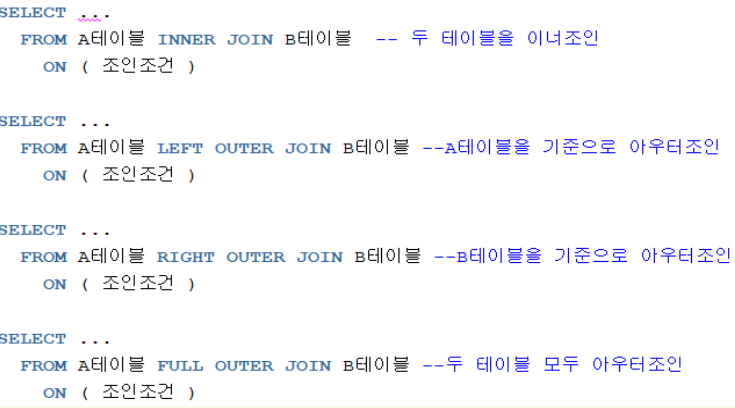 - (+) 기호는 오라클 데이터베이스에서만 사용하는 방식, ANSI(미국국립표준협회) 조인은 모든 DBMS 에서 사용가능