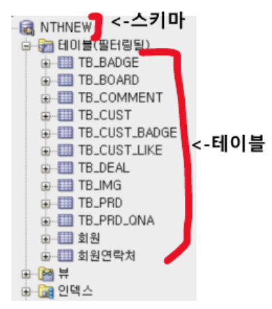 - 스키마: 테이블 등의 저장소 객체를 저장하는 곳