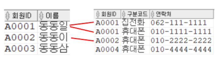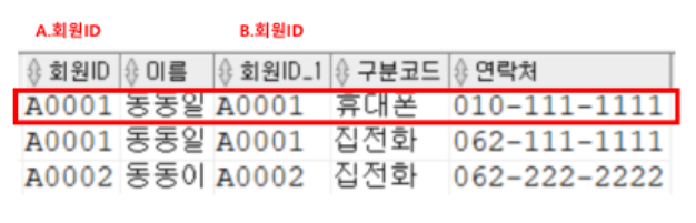 예시 1) 회원 테이블의 회원ID와 회원연락처 테이블의 회원ID가 똑같은 대상만 남겨놓는 조건