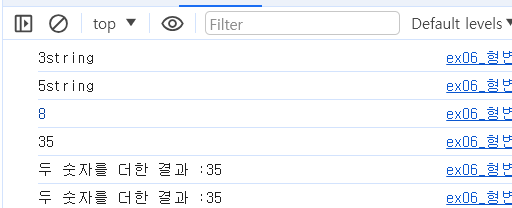 console.log("두 숫자를 더한 결과 :"+ (num1+num2) ); // 8, number->연산->string