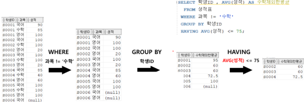 - WHERE절에서는 집계함수를 사용할 수 없다. (WHERE 절은 GROUP BY 보다 먼저 실행되기 때문)