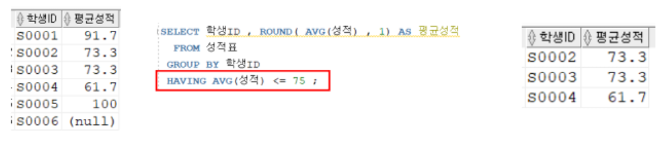 대신 집계함수(=다중행 함수)로 처리한 컬럼은 HAVING , ORDER BY , SELECT 에도 입력이 가능
