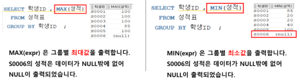 - 그룹 기준으로 입력한 expr 에 대해 최대값이나 최소값을 출력합니다.