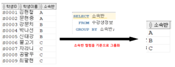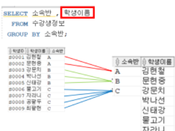 - 특정 컬럼(표현식)을 기준으로 튜플(행)을 그룹화(=묶어서)하여 각각 단일행으로 표기