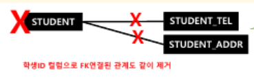 - CASCADE CONSTRAINT 옵션을 추가하면 관련 관계선(FK)도 모두 삭제합니다.