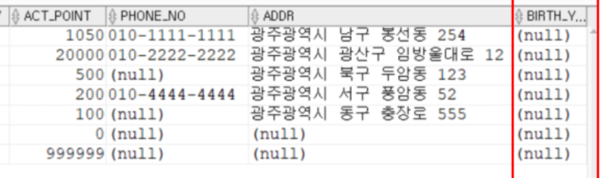 [예시] TB_CUST 테이블에 “BIRTH_YEAR“ 컬럼을 문자형 8BYTE 길이로 추가