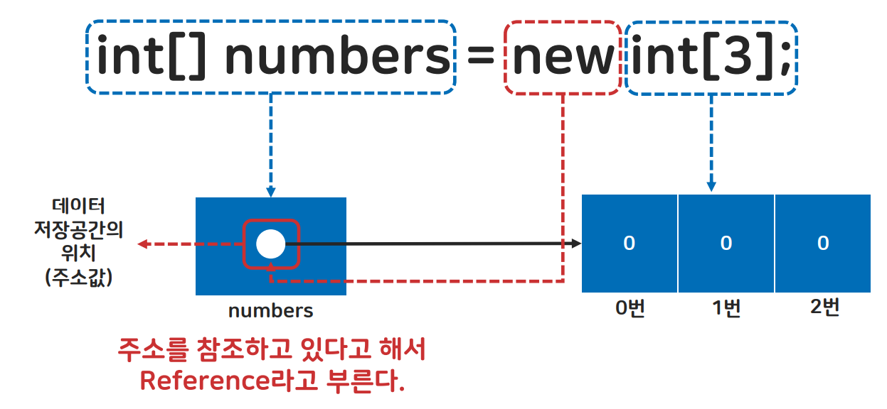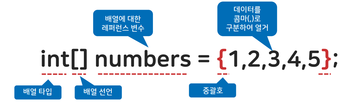- 타입 / 선언 / 배열 이름 = 생성 키워드 / 타입 [배열의 크기] ;