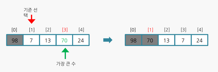 : 가장 큰 원소 또는 작은 원소를 찾아 주어진 위치(리스트 처음~끝)를 교체해 나가는 정렬 방법