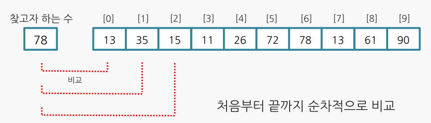 : 가장 단순한 검색 방법으로 원소의 정렬이 필요 없다. 하지만 리스트 길이가 길면 비효율적