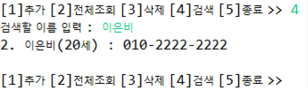 - 검색을 선택할 시 검색할 이름을 입력받아 주소록에 들어있는 이름 중