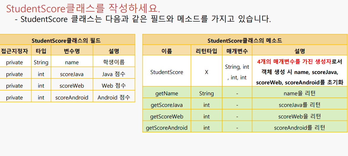 - 3명의 학생 데이터를 입력할 수 있도록 StudentScore객체 배열을 생성 하세요.