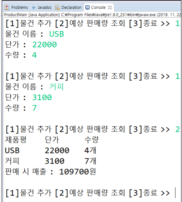 System.out.println("[1]물건추가 [2]예상판매량 조회 [3]종료>>");